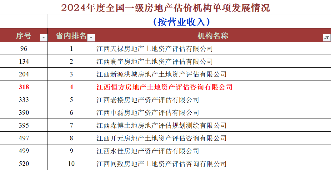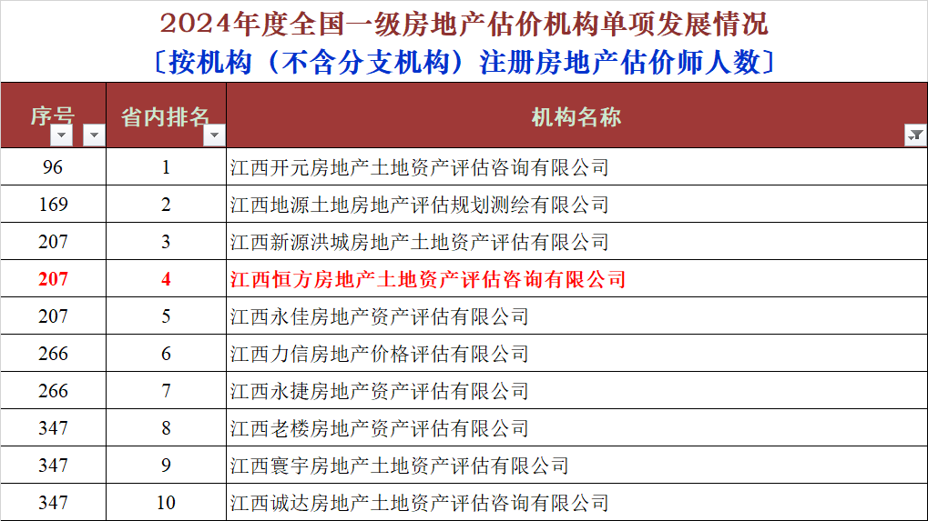 6月17日,中国房地产估价师与房地产经纪人学会发布《关于发布2024年度全国一级房地产估价机构有关情况的公告》,江西恒方房地产土地资产评估咨询有限公司在全国一级房地产估价机构1132家综合排名第161位,多个排名位居省内前列!