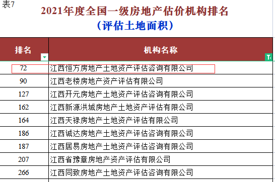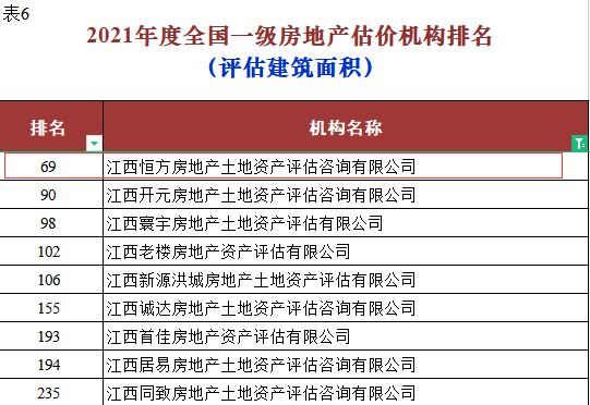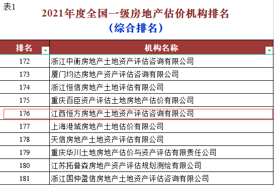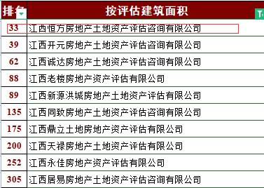 根据中房学《关于发布2021年度全国一级房地产估价机构排名结果的公告》显示,恒方评估在全国952家房地产评估机构中综合排名由去年的第313位提升至第176位!江西省内排名由第六位提升至第四位!其它多项指标,如:评估建筑面积、评估土地面积、房地产咨询顾问等排名进入全国百强!
