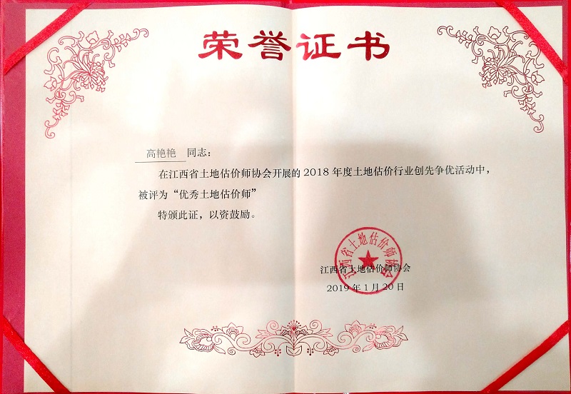 我司估价师高艳艳在江西省土地估价师协会开展的2018年度土地估价行业创先争优活动中,被评为“优秀土地估价师”,特此通报。