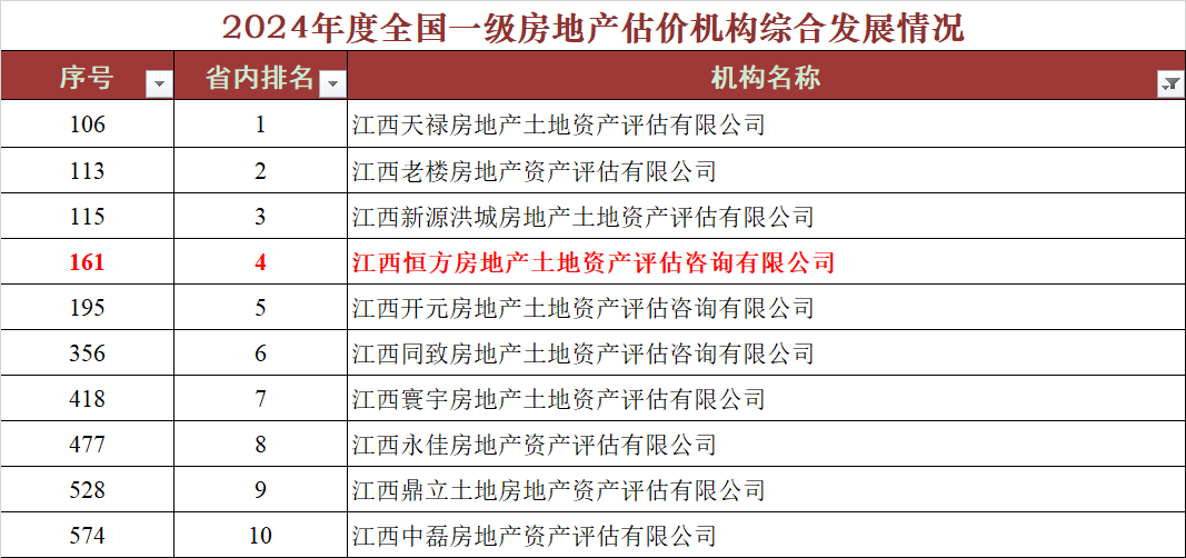 6月17日,中国房地产估价师与房地产经纪人学会发布《关于发布2024年度全国一级房地产估价机构有关情况的公告》,江西恒方房地产土地资产评估咨询有限公司在全国一级房地产估价机构1132家综合排名第161位,多个排名位居省内前列!