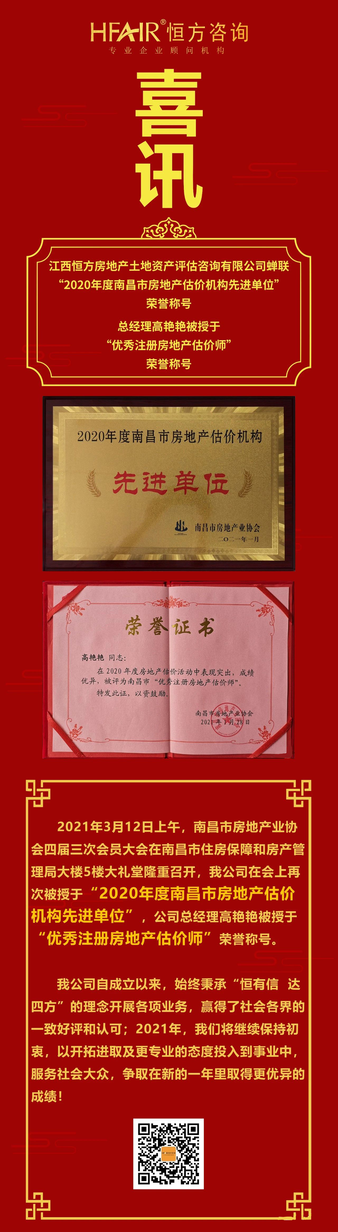 喜讯! 恒方蝉联“2020年度南昌市房地产估价机构先进单位”荣誉称号