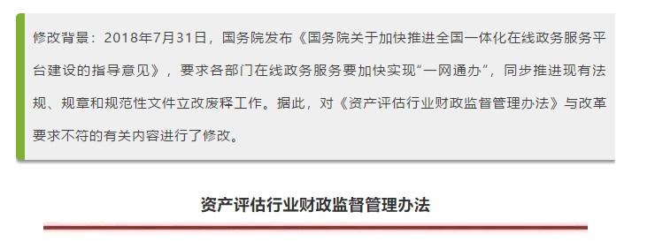 修改背景:2018年7月31日,国务院发布《国务院关于加快推进全国一体化在线政务服务平台建设的指导意见》,要求各部门在线政务服务要加快实现“一网通办”,同步推进现有法规、规章和规范性文件立改废释工作。据此,对《资产评估行业财政监督管理办法》与改革要求不符的有关内容进行了修改。